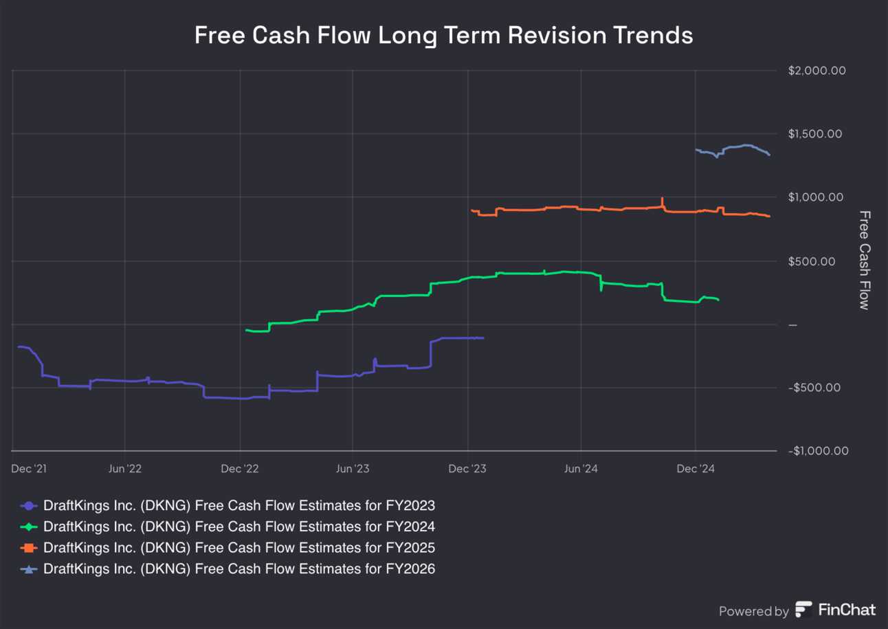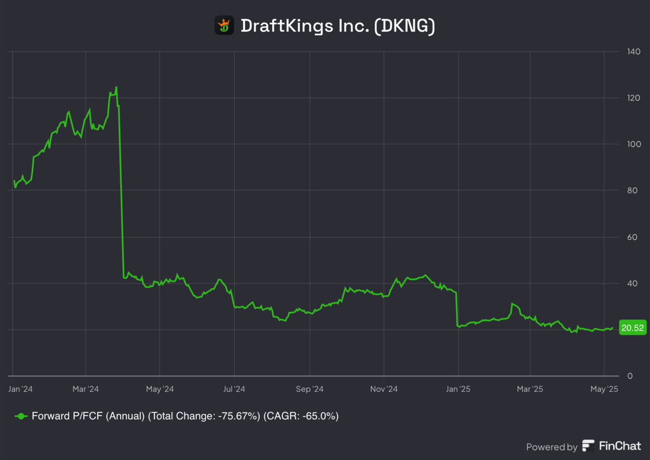 DraftKings trades for 23× updated 2025 FCF guidance. Free cash flow is expected to grow by 84% this year based on its guidance and by 77% next year based on that guide and 2026 estimates. Considering the FCF miss was related to bad luck, I don’t think 2026 FCF estimates will move much. 2025 estimates will fall to reflect the new guidance and the 84% growth projection.