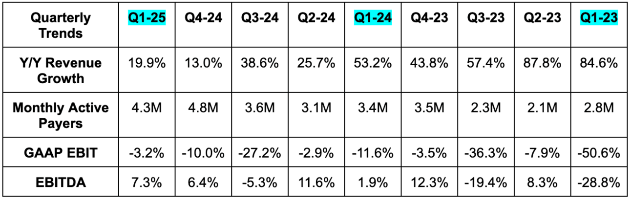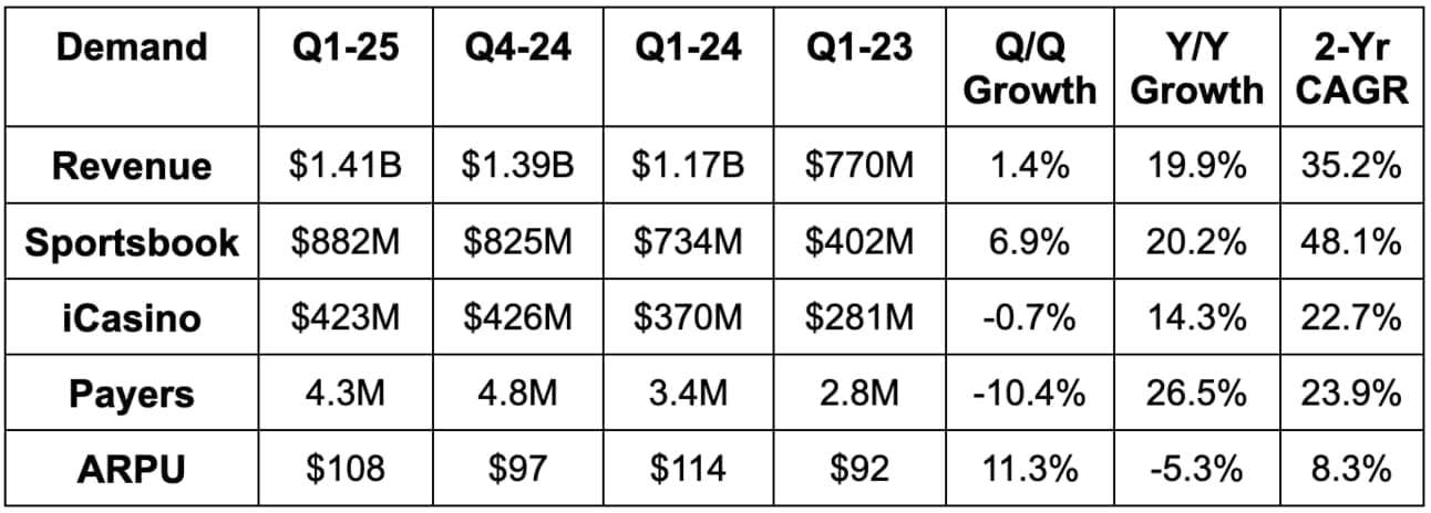 As the review will lay out, all of the misses were based on historically bad outcome luck during March Madness. There was a stretch of over two rounds before the final 4 where not a single underdog one a game. Guidance would have been raised without this headwind. Just like terrible outcome luck during the NFL season. Structural (expected) hold (take) rate remains solid and bad luck will not last forever. It can easily lead to near-term volatility in results, as revenue and profit are byproducts of hold, but is not a structural concern to me. I care about thriving payer growth, market share gains, top-line expansion and OpEx control. If they’re executing in those places like they are, profits will follow when more normal outcome patterns come back. They are not changing anything about the odds structure of their bets, as again, this is not at all structural.