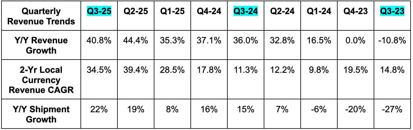- Its 38.4% 2-year revenue compounded annual growth rate (CAGR) compares to 38.5% last quarter and 23.6% 2 quarters ago.