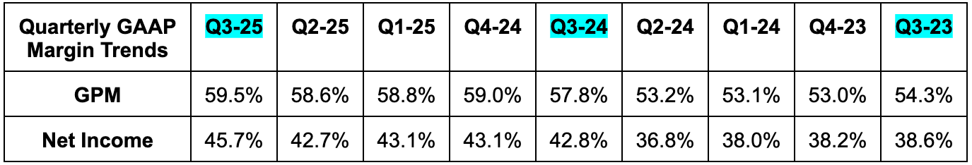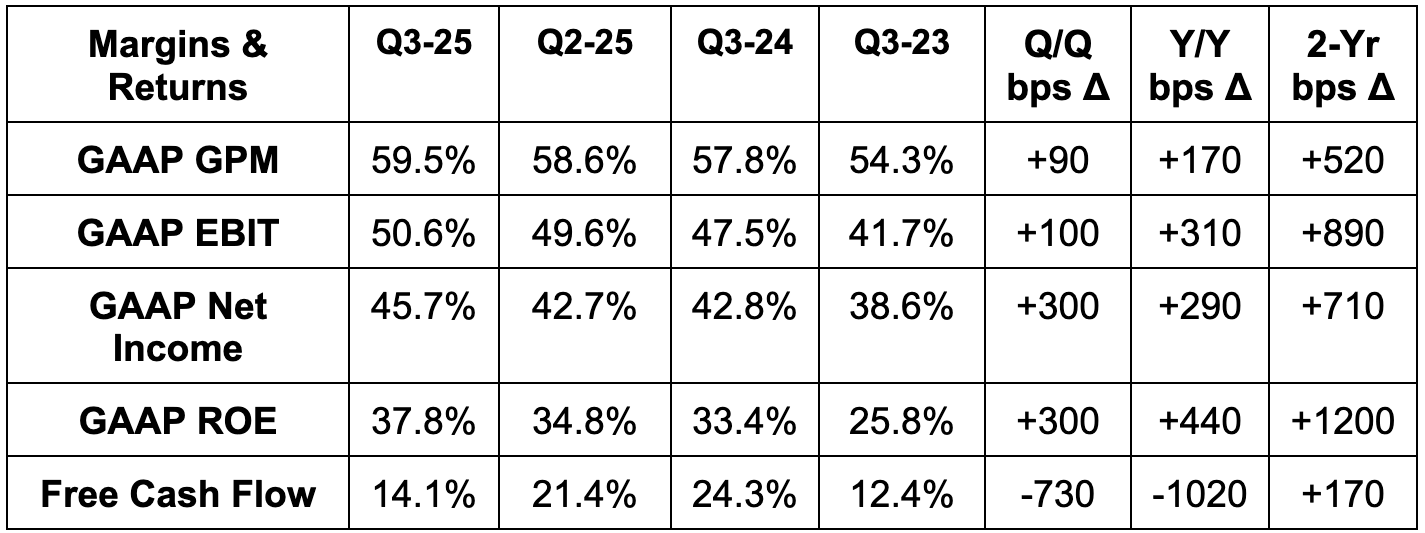 - Beat 56.5% gross profit margin (GPM) estimates by 300 basis points (bps; 1 basis point = 0.01%) & beat guidance by 220 bps. A lot more on this later.