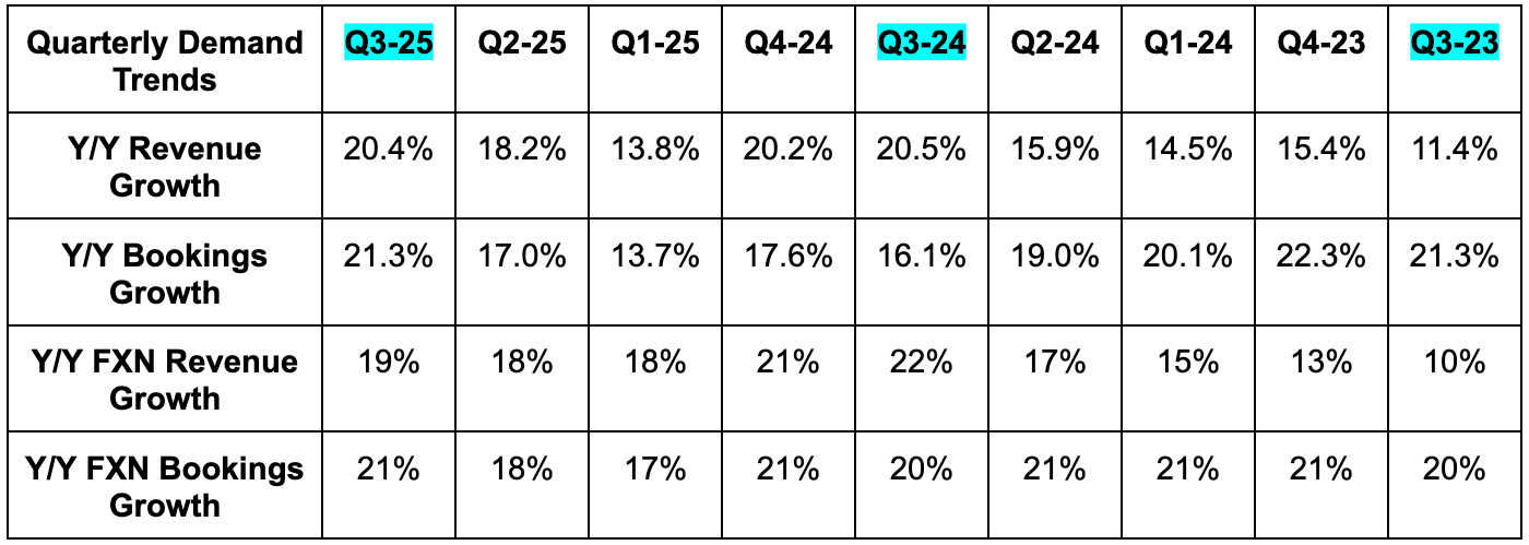 - Foreign exchange (FX) was as expected. It did not help the revenue or bookings beats.