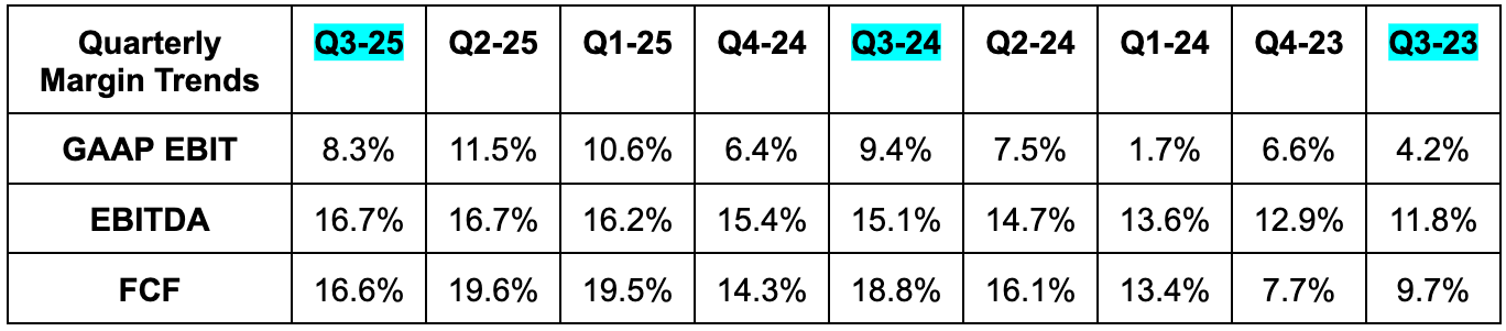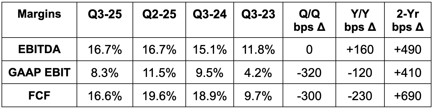The GAAP EBIT margin contraction isn’t concerning. It’s related to a telegraphed acceleration in targeted investments (more later) and a $479M legal charge. Ex-legal, EBIT margin would have been 11.8% for a new company record.