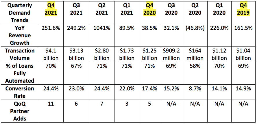 Over the first 9 months of 2021, Upstart’s proportional capital market reliance was at 76.7%. That falling to 74.1% for 2021 as a whole (including the 9 months at 76.7%) marks meaningful progress in eroding Upstart’s capital market needs. For this quarter specifically, Upstart’s capital market reliance fell to 69.3% of total volume. I was not expecting this improvement to come until further into 2022 (as deposit levels and savings rates normalized) — so this was a pleasant surprise. In 2022, I will be looking for proportional capital market reliance to fall further as that would make delivering profitable loan pools easier and more sustainable for Upstart.
