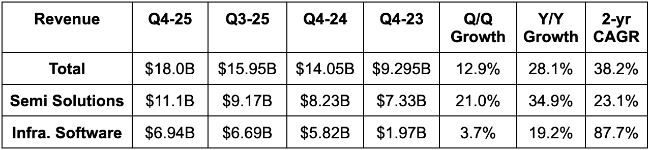 - Guided to $6.8B in infrastructure software revenue growth, representing just 2% Y/Y growth. For FY 2026, they reiterated low double-digit growth for this segment.