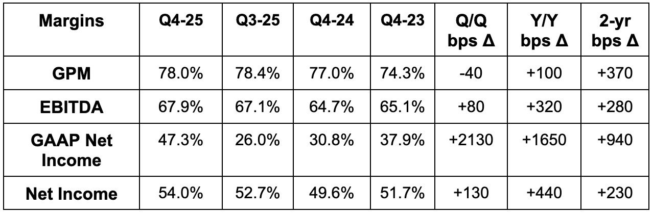 - EBITDA margin expanded Q/Q despite the Q/Q GPM decline due to strong and broad-based leverage across operating expense (OpEx) buckets.