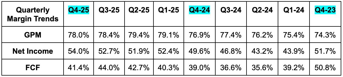 - Q1 GPM guidance of 77% slightly missed 77.2% estimates.