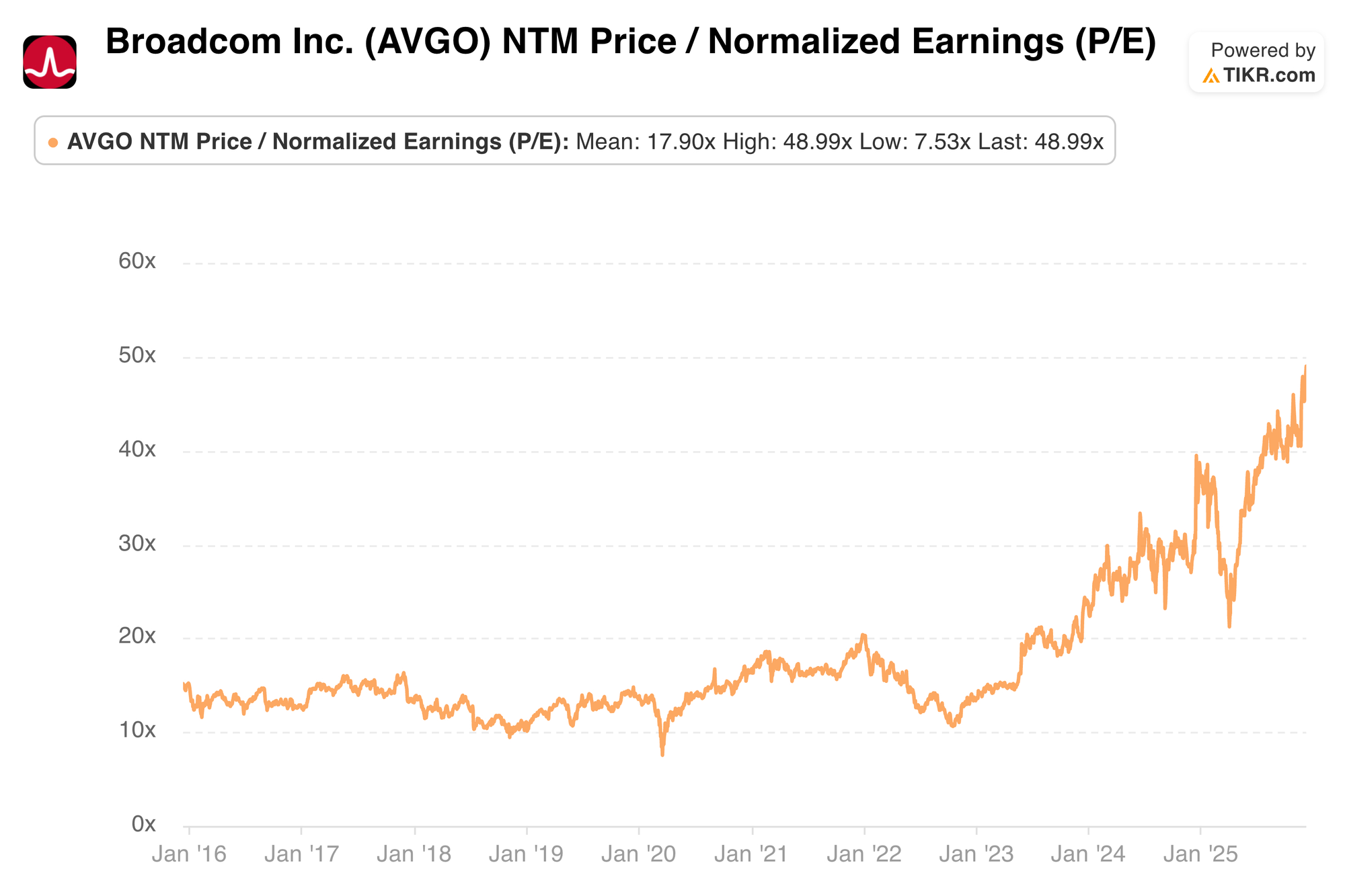 As of right now (pre-revisions), AVGO trades for about 43x FY 2026 EPS. EPS is currently expected to grow by 52% next year and by 46% the following year.