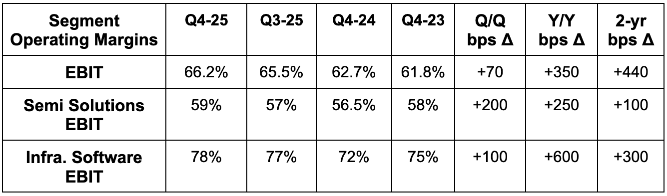 Bookings growth for this segment remains at a strong 26% Y/Y clip, while margins are exploding higher with VMware integration work in the rearview. We did not hear much about this segment. They’ve essentially finished migration to the VMware Cloud Foundation (VCF) offering. As a reminder, VCF “enables the entire data center to be virtualized and customers to create their own private cloud environment on-premise.” This frees them to run their apps in reliable, scalable places other than in a public cloud. And that's a timely addition to AVGO's value prop. With data leakage a heightened risk and focus area in the age of GenAI, many customers are re-thinking how much of their infrastructure they'd like to maintain privately. Now that the VCF evolution for the existing base of customers is finished, they will increasingly focus on workload growth for the segment.